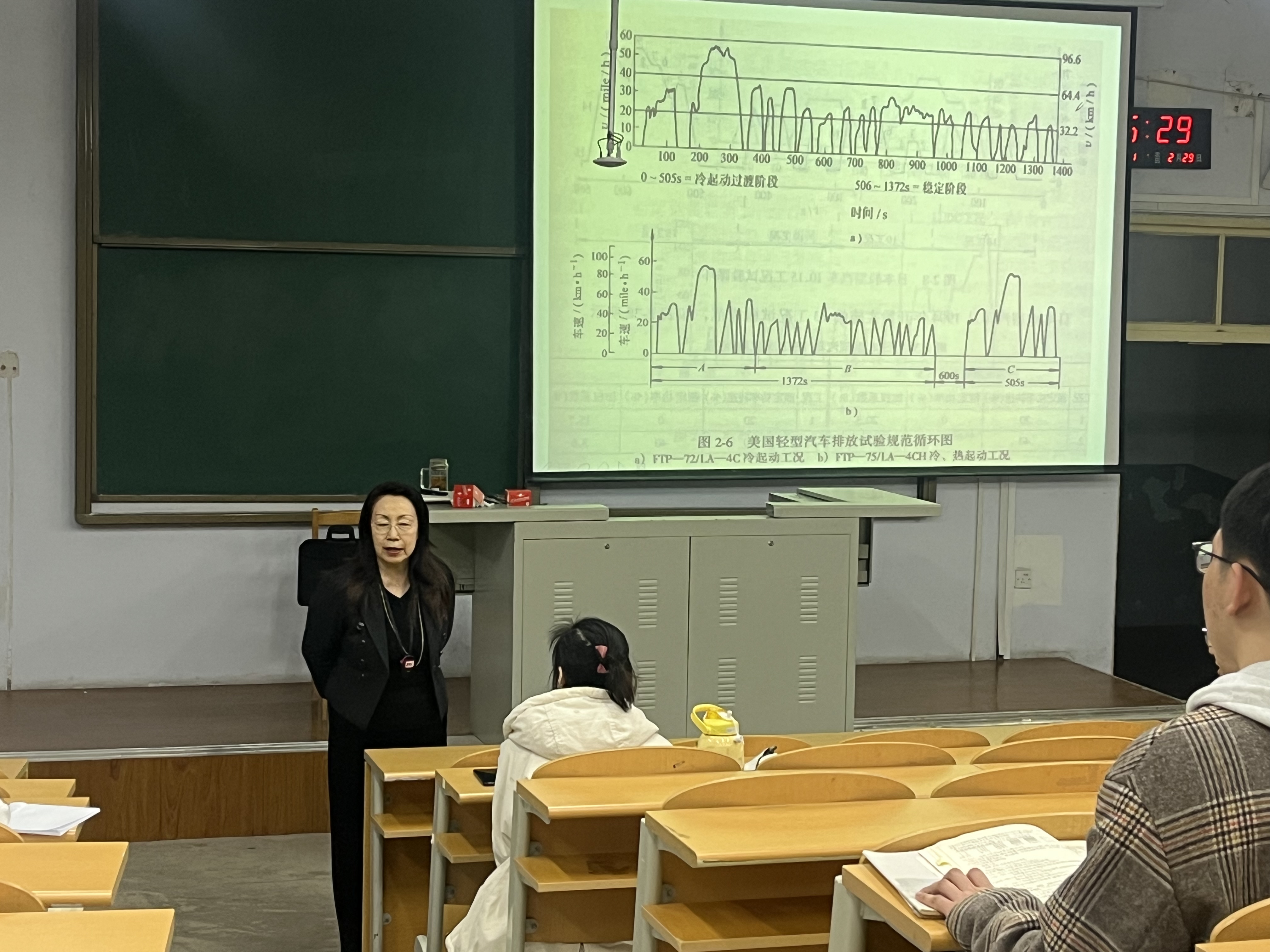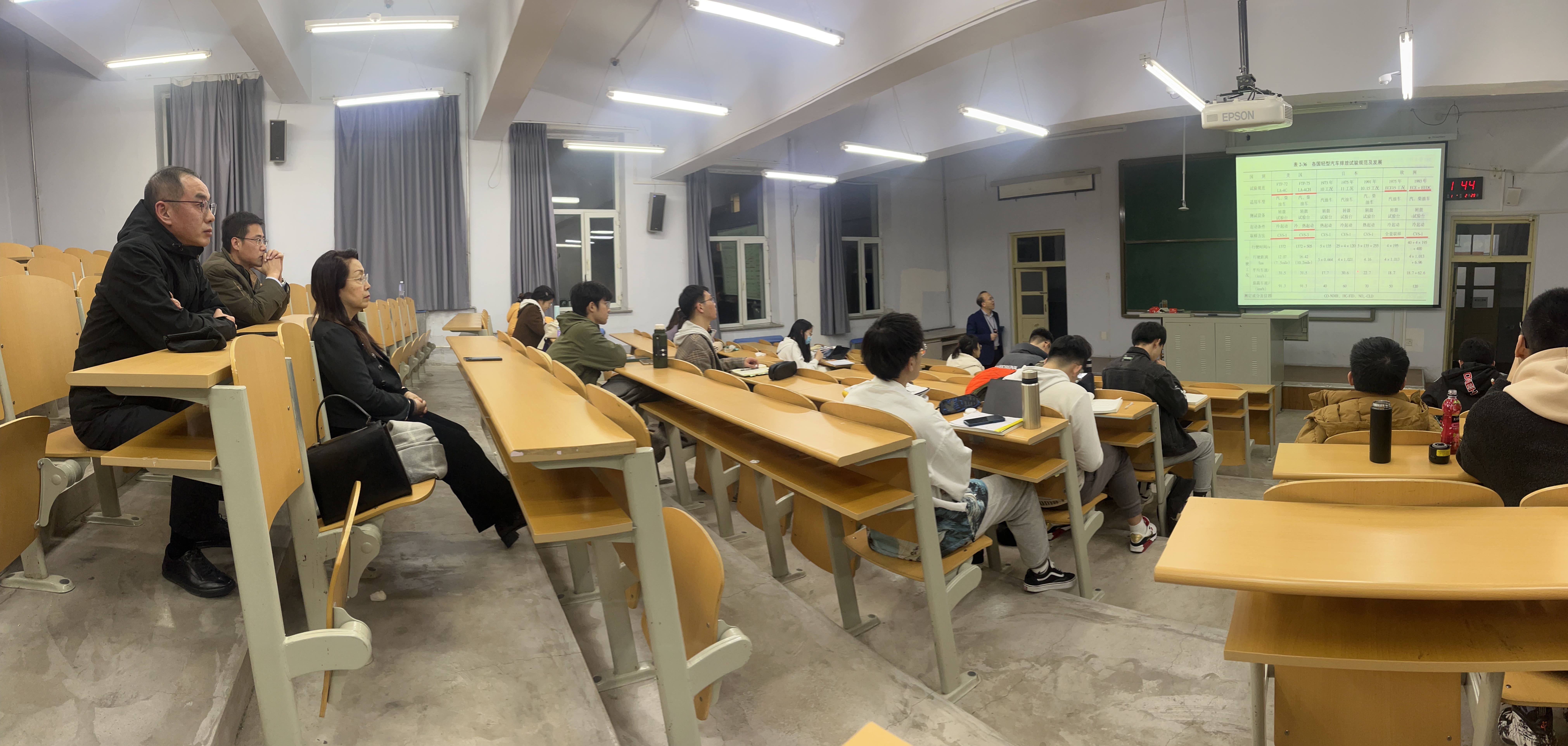 为了深入体会大学时代上课时的一点一滴,三位校友一行专程深入到院长李世武正在授课的“汽车排放与污染控制”本科生课堂,同本科生一起听取了近两节课程,并利用课间休息过程与同学们进行了一次近距离的交流。王丽梅会长感恩于母校对自己的教育培养,对自己人生产生了深远影响,分享了近40多年的工作经历,从汽车运输行业的角度强调了夯实专业基础对日后工作的重要性,深入分析了全国运输行业的发展现状,描述了交通运输行业的美好前景,最后还对母校母院学子提出了殷切期望,鼓励同学们树立远大理想,不忘初心,砥砺前行,为道路运输行业为交通强国贡献力量。