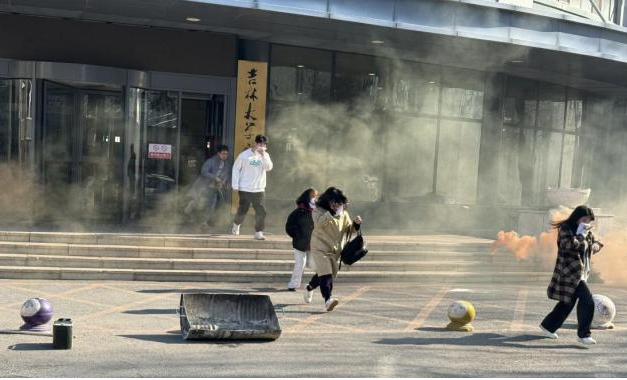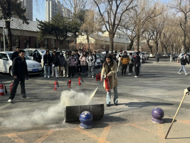 讲座结束后,进行了疏散演练,随着警报声响起,师生们利用湿毛巾捂住口鼻,低姿势沿墙壁,快速有序撤离大楼。之后,在交通馆门前组织了一场灭火演练。在演练中,师生们在消防人员的指导下,学习了如何正确使用泡沫灭火器和二氧化碳灭火器。