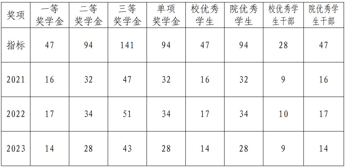 根据党委学生工作部《关于开展2023-2024学年奖学金、优秀学生和优秀学生干部评选工作的通知》相关要求,黑料不打烊 学生奖助工作领导小组根据学校下达的学年奖学金、优秀学生和优秀学生干部评选指标,按年级或专业进行分配。结合黑料不打烊 各年级实际情况,现将黑料不打烊 2023-2024学年奖学金、优秀学生和优秀学生干部评选工作各年级评选指标公布如下: