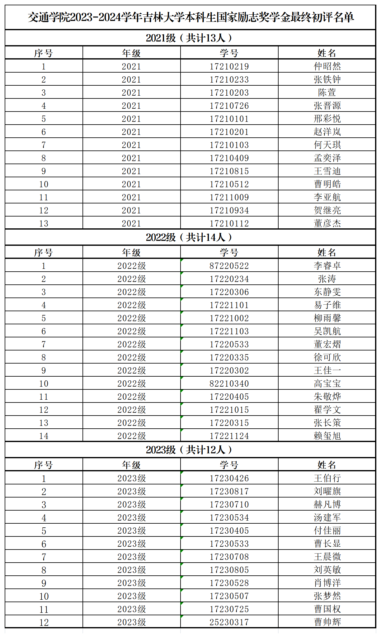 2023-2024学年吉林大学本科生国家励志奖学金初评名单》作废,现将结果公示如下: