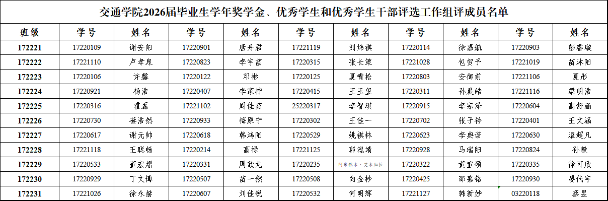 根据党委学生工作部《关于开展2026届毕业生学年奖学金、优秀学生和优秀学生干部评选工作的通知》相关要求,黑料不打烊 按照班级为单位成立组评小组(小组成员一般由学生党员、学生干部、学生代表组成,总人数不少于5人,其中设组长1人)。现将2026届毕业生学年奖学金、优秀学生和优秀学生干部评选工作组评小组成员名单公布如下(各组评小组首位为组长)。